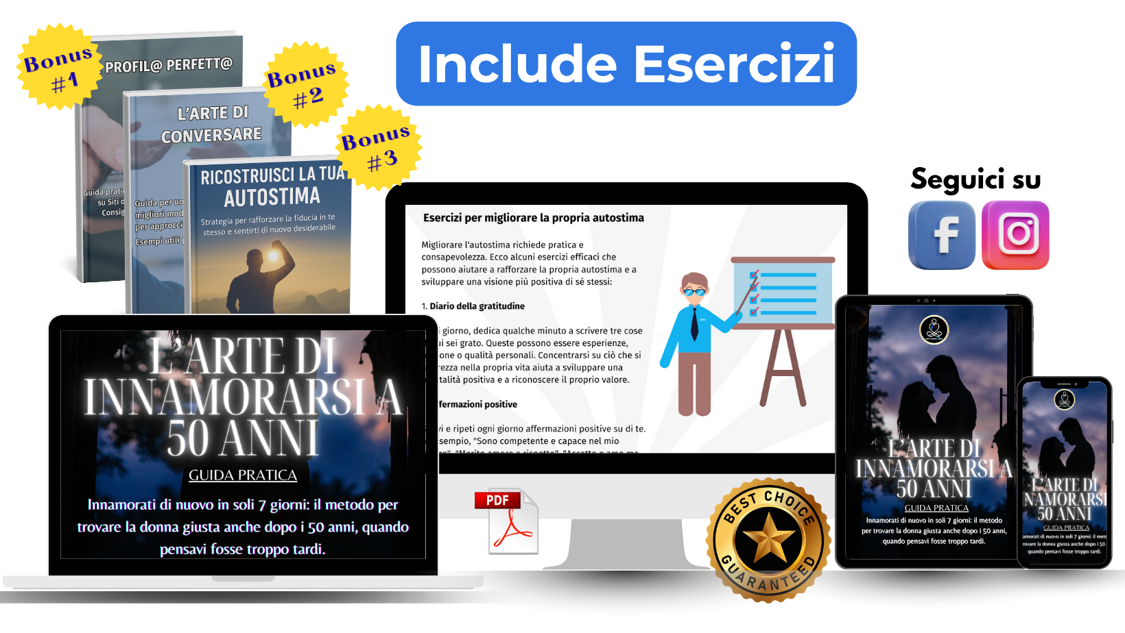 Le strategie di comunicazione e i consigli su come superare le insicurezze mi hanno aiutato ad avvicinarmi agli altri con naturalezza. Ho iniziato a frequentare nuovi posti, ho stretto amicizie e mi sento finalmente pronto per una relazione autentica. Questa guida non mi ha solo aiutato a trovare l’amore, ma mi ha dato una nuova prospettiva di vita. Se sei single e pensi che sia troppo tardi, ti consiglio questa guida al 100%: è la svolta che meriti!"